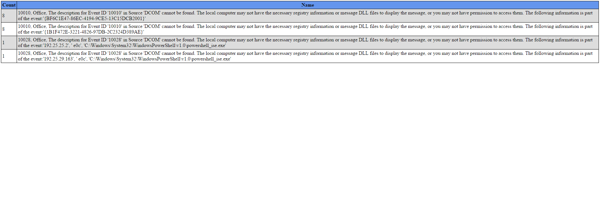 I am trying to produce a script that gets the event error log and organize event id by count, under the name column I get the event ID, machine Name, Message. I want the 3 fields to display in there own column to make it easier to read, and keep the count column. Is there a better way of achieving the results?