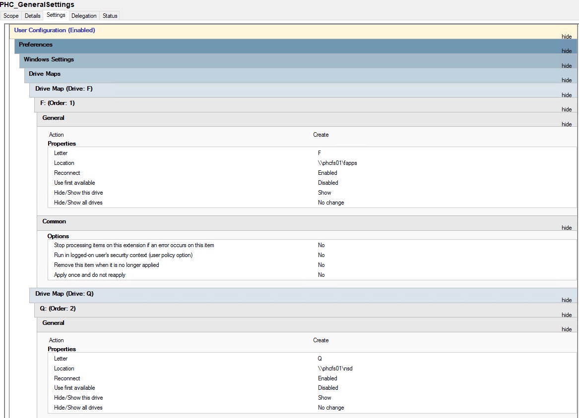 The ultimate goal is to be able to export Computer and User GPO settings so they can be imported in to a different system. Different system means a new Active Directory Domain that is independent of the source domain. I have certain system settings like Event Log sizes or firewall exceptions that I used to deploy by hand. I’ve completed Computer GPO’s, where I can export them to a CSV file and easily import them to a new system. It’s essentially automation so I don’t make a mistake entering it manually. User GPO’s are more difficult. For the time being I’ve created a ZIP file of the \domain\sysvol\domain\policies*.xml including the full path so I can at some point import the data in to the GPO. I’m attaching a screen shot of a GPO User Configuration settings where it maps an F: drive and Q: drive.