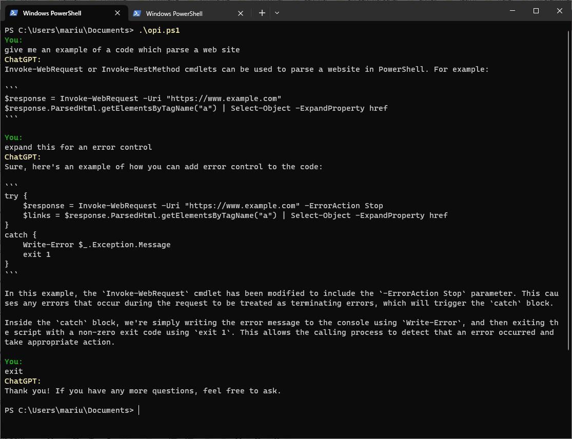 I thought that some of you might find this helpful, so I am sharing a simple script which connect to ChatGPT to get simple answers on Powershell related issues directly in the console.