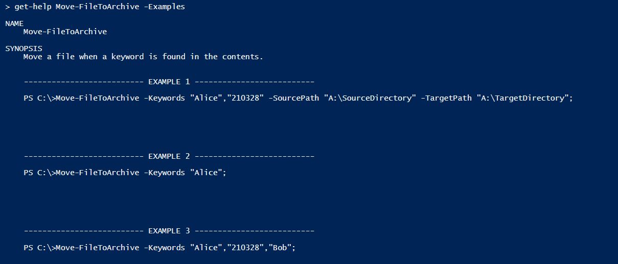 Delete HelpUri = "Keywords should include: Sender, FileDate, or RecordType", and your users will be able to get this info using Get-Help Move-FileToArchive -Examples