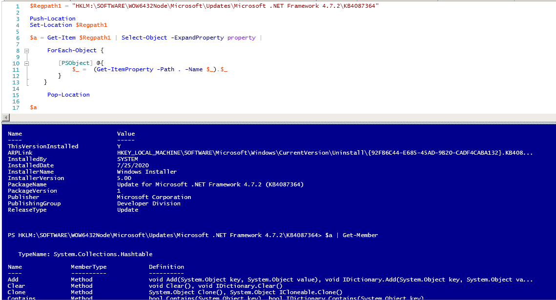 @krzydoug perhaps that is the issue. If it is, I don’t understand. The properties that list in $a are within the key ‘KB4087364’. This is how the variable gets populated so I can read it in the console. But any attempt to use ‘$a.anything’ is met with an error about no property.