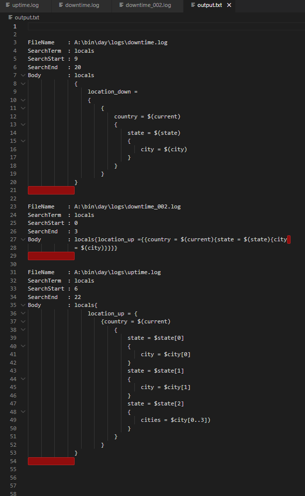 Step 4 - Output the filename, textsearched for (in this case “locals”) and the text found between the braces.