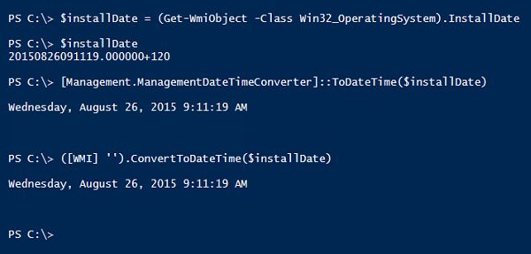 Get-WmiObject Win32_OperatingSystem | select @{N=‘ReadableInstallDate’;E={ $.ConvertToDateTime($.InstallDate) }}