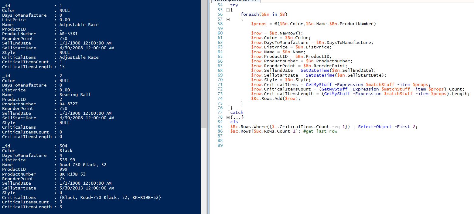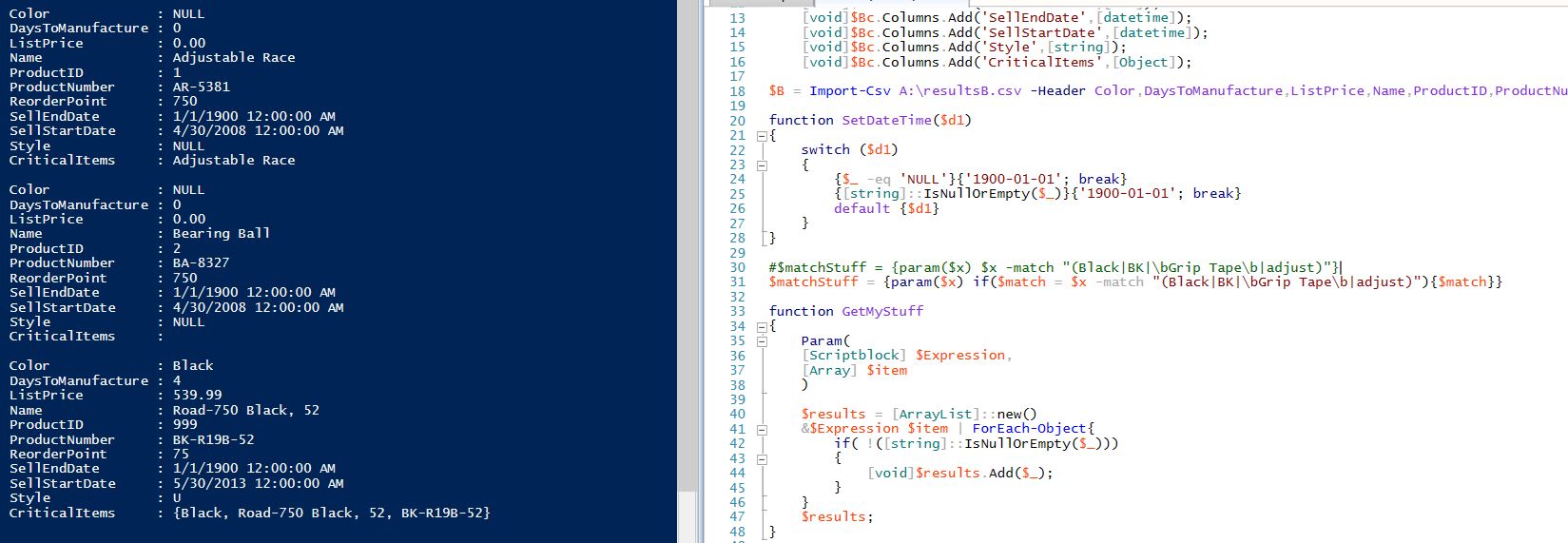 The problem appears in GetMyStuff when no matches are made. I’ve attempted different approaches that would ignore the Add() method when zero matches are produced. However, the count on CriticalItems is never less than 1 (the appropriate value when Add($null)). There may be something bound up in &$Expression $item or inherent with the column’s datatype [Object] that in my mind works like T-SQL’s sqlvariant type.